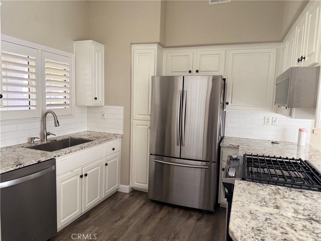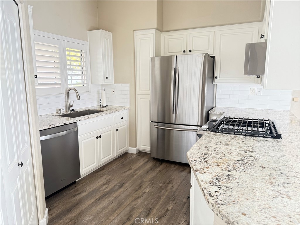 Beautiful 55+ Community at The Colony!!! Enjoy 2 bedroom, 2 bathroom with many upgrades including wood LVP flooring throughout, new carpet in both bedrooms, upgraded lighting, 3 inch custom plantation shutters throughout, 4 inch baseboards throughout, granite kitchen, stainless steel appliances, includes Samsung stainless refrigerator and upgraded washer and dryer. Large primary room with slider to backyard patio, newer upgraded custom shower w/built-in teak foldable seat, upgraded lighting, large walk-in closet, granite counter with double sinks. Secondary bathroom with walk-in shower-tub, upgraded lighting. This property includes 2 seperate patios with newer alumawood (one solid, one open) with sun shades, nicely landscaped, new back rod iron fencing. 2 car garage with insulated garage door for the hot months, brand new water heater, solar carriage lights. Don't miss out on this darling home, one of the lowest priced in the Colony.