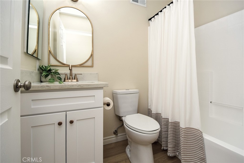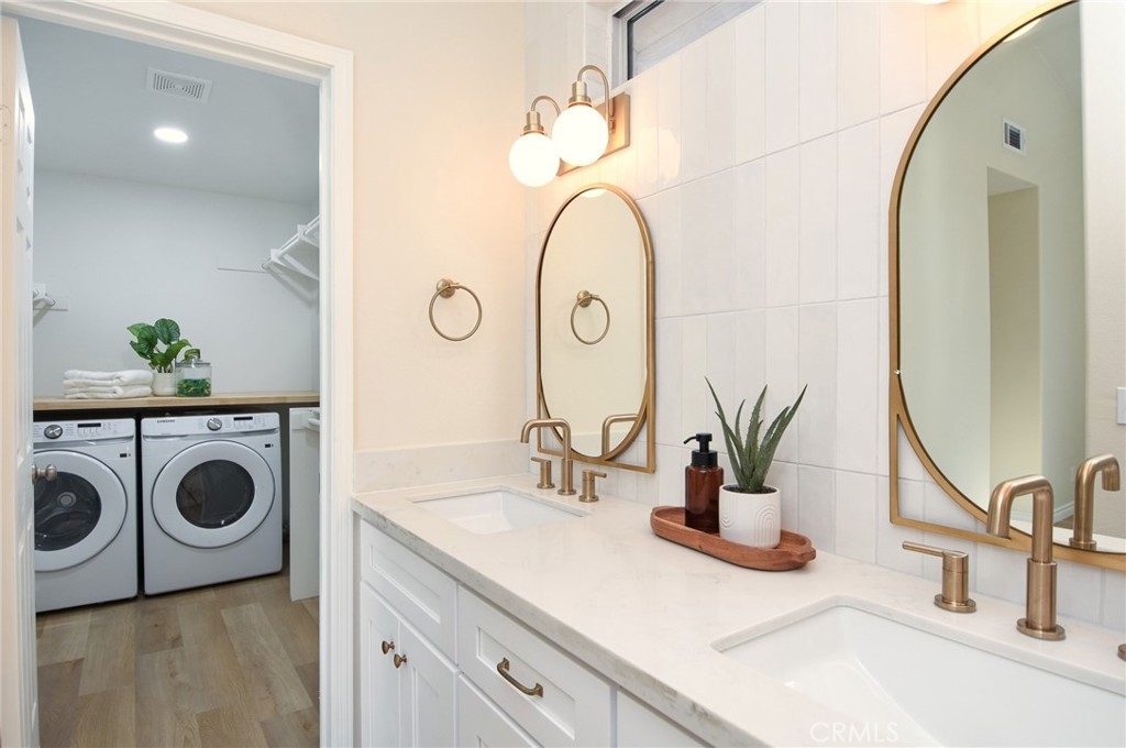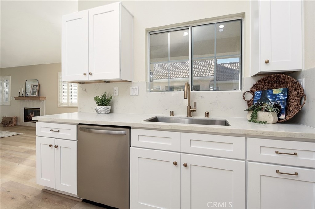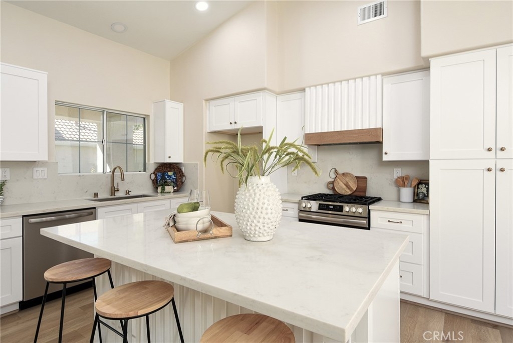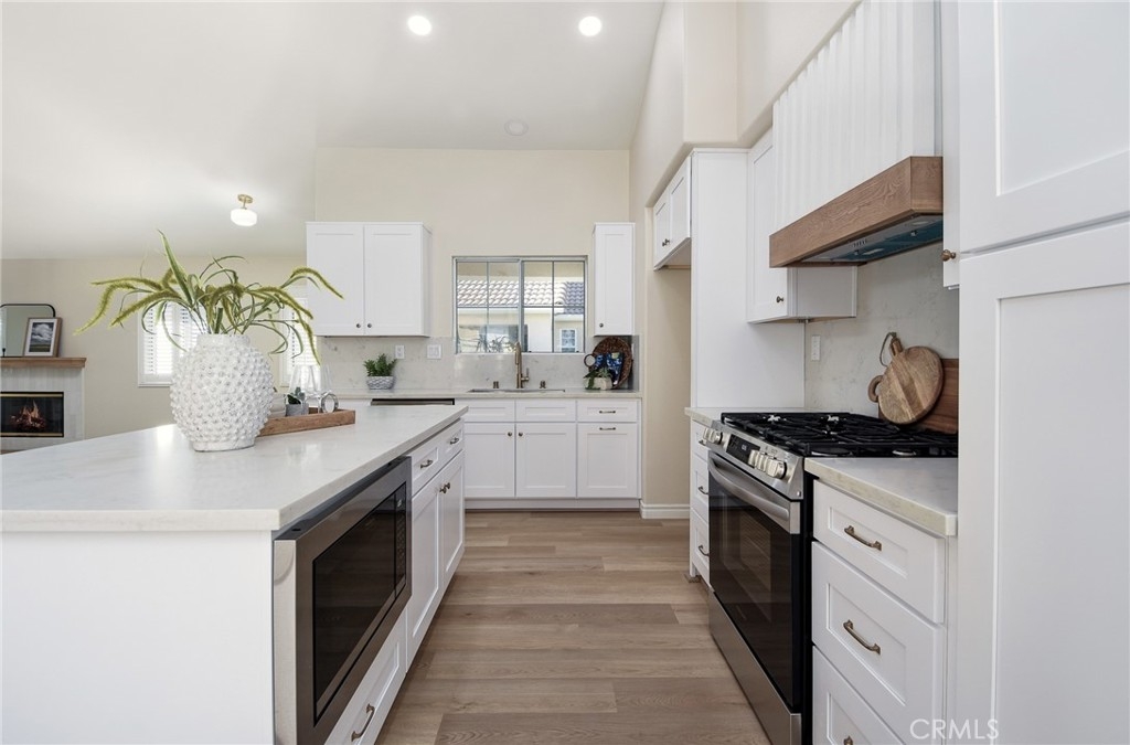 Are you looking for a home that has that new, never lived in feel but in an established, premier 55+ community? Here is a rare opportunity to buy a modern and renovated home in the much sought after community of The Colony in Murrieta. Bright and open, this home has been fully renovated and upgraded throughout. Upon entry, you will notice brand new, wood look LVP flooring, new paint, upgraded baseboards and trim. The kitchen has been fully modernized with brand new cabinetry, quartz countertops, Champagne brass hardware and matching Delta faucet, custom built hood range trimmed in white oak, and slatted, large center island. All appliances are brand new including a stainless steel dishwasher, gas range, microwave range hood. Take a step into the primary bedroom and you will see vaulted ceilings, fresh paint and trim, and continuous flooring throughout. The primary bathroom has been renovated with a new, double sink vanity, quartz countertops, Delta faucets and Kichler lighting. The master shower has been retiled with modern, exquisite subway tile. The washer and dryer are conveniently located in the primary closet where they are easily assessable. Brand new washer and dryer included in the sale. Step outside on the back patio and enjoy the sunny California weather. The backyard is adjacent to a green belt which is peaceful and private. This home is part of the Colony community that includes a 24-hour guard gate, a resort style clubhouse, a pool and 2 spas, lighted tennis, paddle tennis, pickle ball, gym, auditorium, cards, hair salon, library, billiards and lots of other activities, parties, events, concerts, movies and planned group trips. An 18-hole golf course is inside the gate.