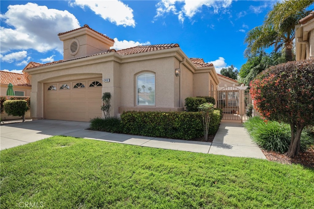 You will love this BEAUTIFUL HOME in a PREMIUM LOCATION in The Colony, one of SoCal's finest 55+ GATED communities. You have wide open space behind you that OVERLOOKS the GOLF COURSE with a POND VIEW so you can watch the golfers & the geese from your covered patio. A large gated entry courtyard welcomes you to this one-of-a-kind floorplan. There is a living room which shares a see-through fireplace with the family room. The open concept kitchen features stainless steel appliances with a built-in desk, an eating nook & you also have a formal dining room. The primary bedroom is very spacious with a large walk-in closet and adjoining bathroom. The guest bedroom also has a bath nearby. The PATIO is so INVITING with VIEWS of swaying palm trees near the entry gate, the golf course & the mountains in the distance. There is lots of space on the side of the home with another patio & easy care landscaping. The exterior was painted in 2020. HVAC system is updated. Water heater NEW in 2020. Wrought iron fence NEW in 2019. Indoor laundry room. This great location is very near the SPECTACULAR CLUBHOUSE with a YEAR-ROUND POOL, 2 spas, PICKLE BALL / paddle tennis, tennis, bocce and a huge outdoor eating area around the pool. The clubhouse features a gym, library, card rooms, billiards, ping pong & a convenient hair/nail salon. The huge AUDITORIUM hosts shows, concerts, dances, banquets, movies & PARTIES FOR ALL OCCAISIONS. HOA waters & maintains all front yards. Guarded gate & 24 hour patrol add to your security & peace of mind. Call today to start your life of RESORT STYLE SENIOR LIVING.