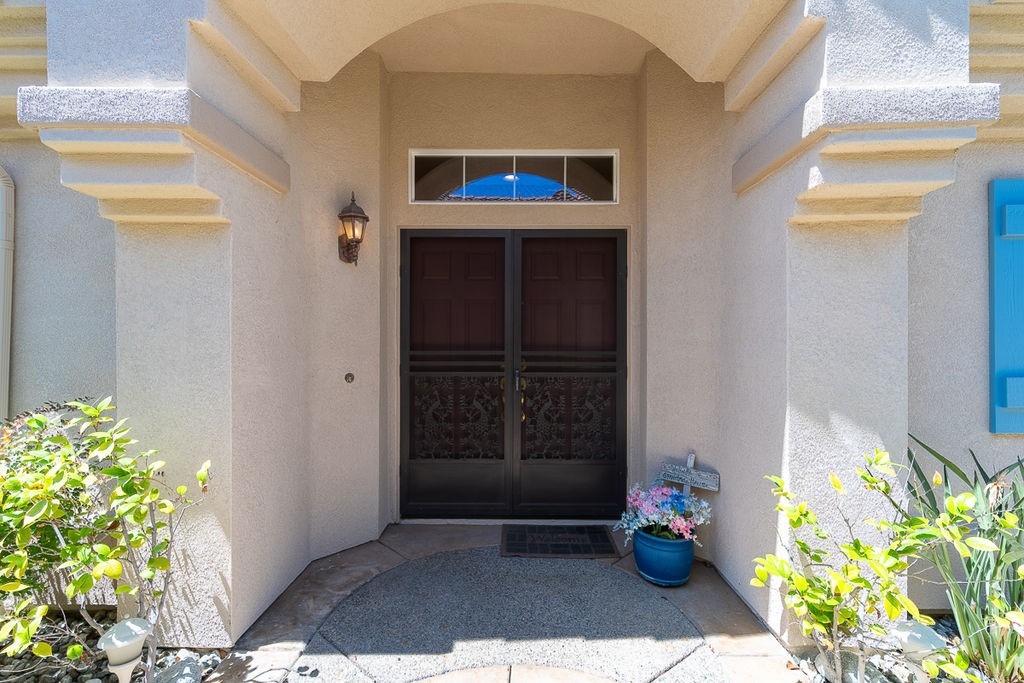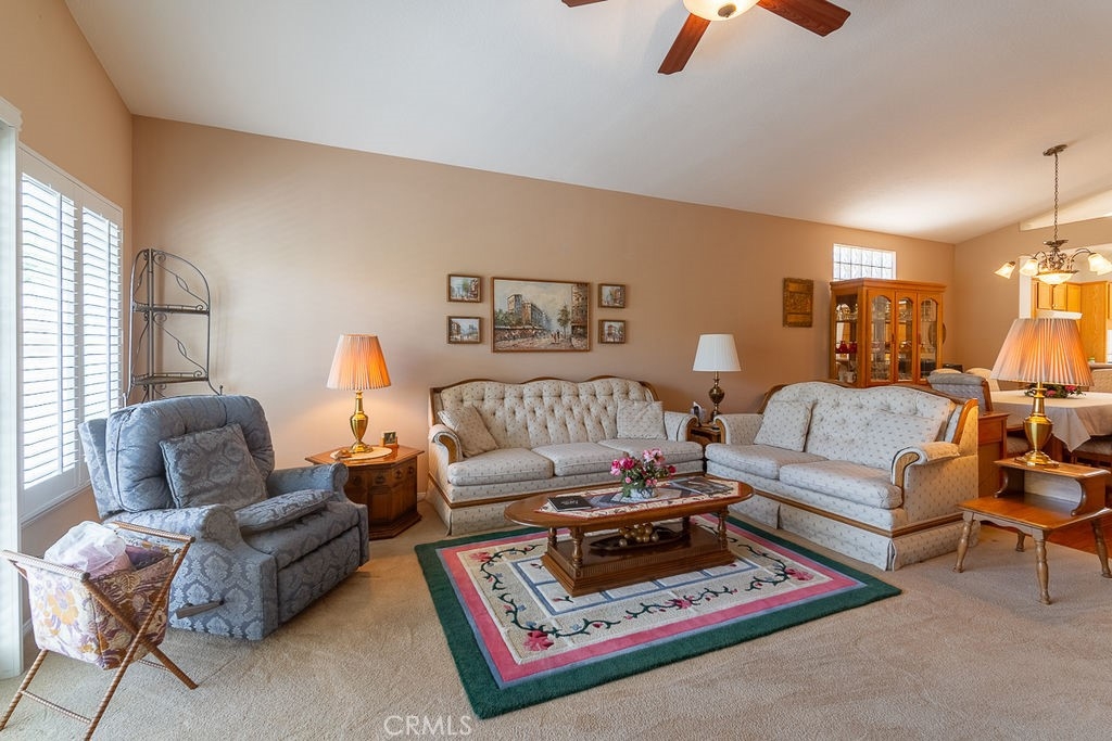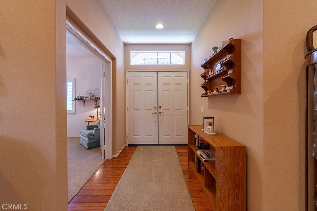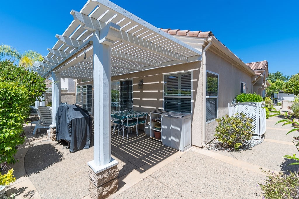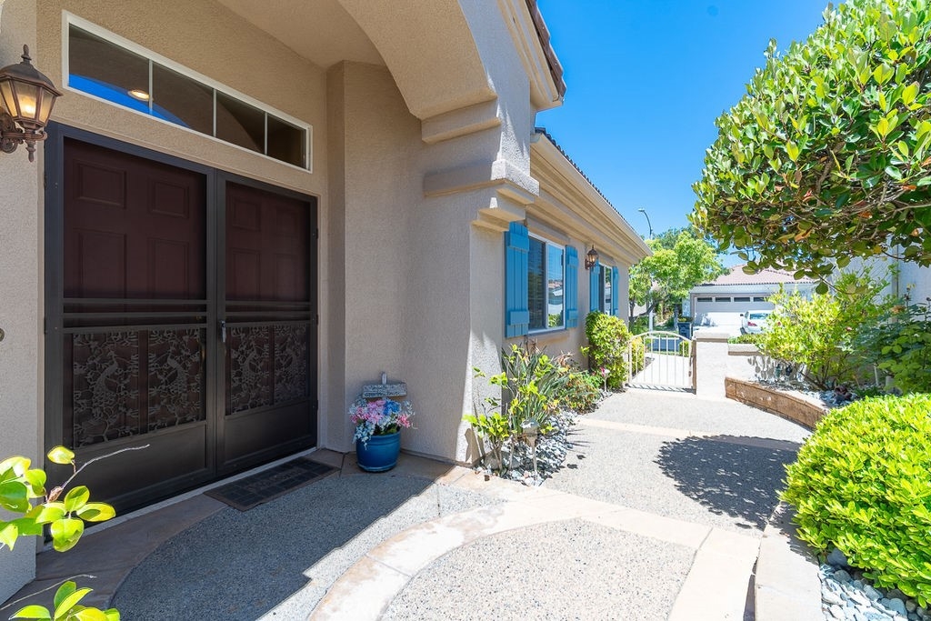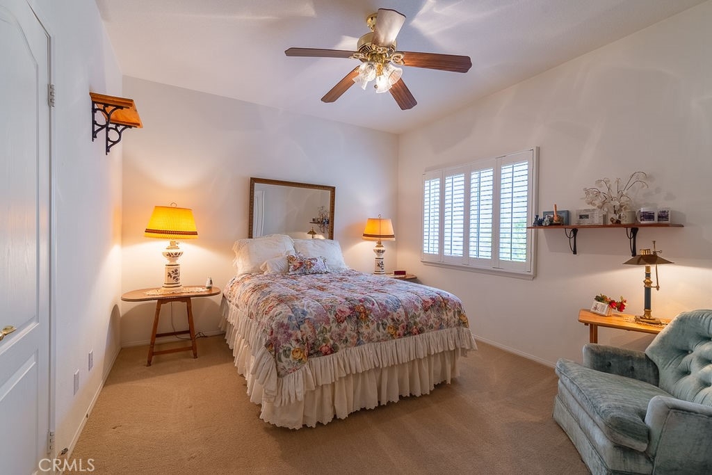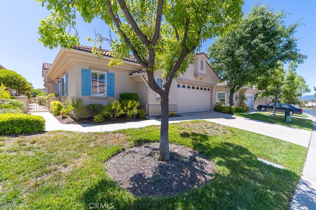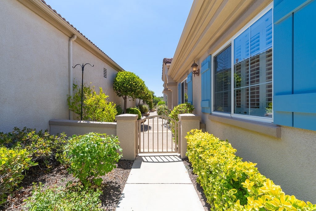 FRESH EXTERIOR PAINT adds lots of curb appeal to this SINGLE STORY 3 BEDROOM 2 BATH HOME on a quiet interior street in The Colony, for ages 55+. The entry walkway has great hardscape and landscaping as you approach the double front doors. You will love the RICH WOOD FLOORING, WINDOW SHUTTERS, soaring ceilings & great natural light. The great room is plenty large enough for family gatherings or parties. The large kitchen has corian countertops and so much storage and countertop space. The spacious primary bedroom suite has a lush bath with 2 sinks (corian counters), a soaking tub, separate shower and a large walk-in closet, customized ala "California Closets". The second bedroom is well separated and is oversized with space for a bedroom + desk or sitting area + a bath nearby. The third bedroom is used as a double-door den off the entry and it has a walk-in closet. There is a large laundry room with a convenient sink and lots of storage and countertop space. The patio is so inviting and looks out on a greenbelt maintained by the HOA. The AC was replaced about 5 years ago and water heater was replaced in 2022. The Colony is a PREMIER GATED SENIOR COMMUNITY for ages 55+ with a RESORT CLASS CLUBHOUSE, year-round pool, 2 spas, lighted pickle ball/paddle tennis and tennis courts. You can enjoy the gym, library, ping pong, billiards, hair/nail salon. There are groups & activities for all interests with an auditorium for shows, dances, banquets, concerts, movies, bingo & parties for all occasions. A privately owned 18-hole golf course is inside the gate. The HOA waters & maintains all front landscaping. Guard gated entry and 24-hour security patrol give you peace of mind. You will love the friendly neighbors and sense of community as you enjoy TRUE RESORT STYLE SENIOR LIVING in The Colony.